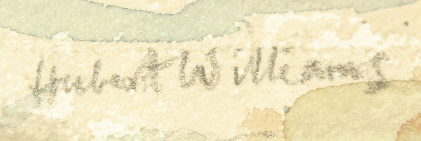 Hubert Williams (20th Century), 'West Mersea, Essex', a row of green beach huts and figures along the coast, watercolour, signed, inscribed and dated 20 Sept '64, paper size 11.25" x 15", (28.9x38cm) and men chopping wood, children collecting wood in a barrow and riders on horses near a cottage, watercolour, signed and inscribed in pencil, image size 7.5" x 11.25", (19.28.5cm) along with two child studies of a young boy making a paper chain 7" x 9", (17.5x 22.5) and in the garden, 6" x 8", (15x20cm) both pen and ink and initialled, (all unframed) (4).