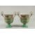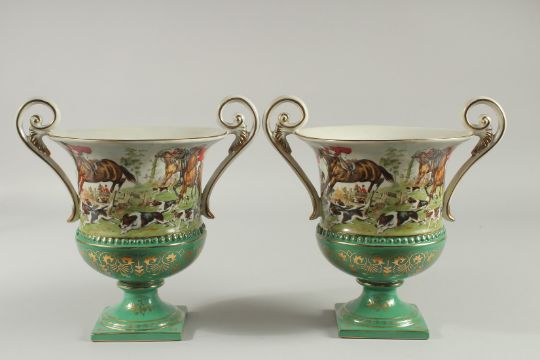 A PAIR OF SEVRES DESIGN GREEN GROUND TWO HANDLED URN SHAPED VASES with hunting scenes.