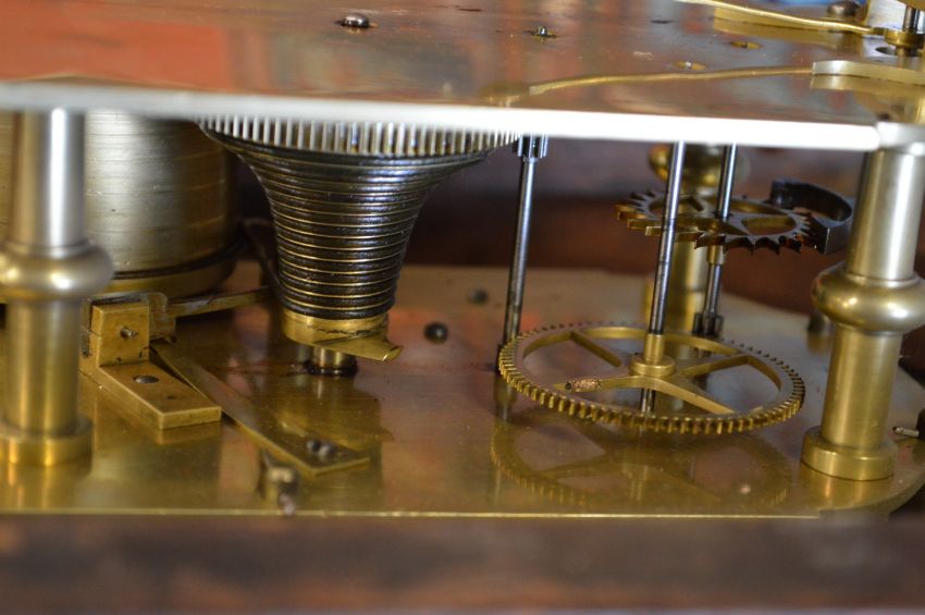 A Regency brass inlaid mahogany drop dial wall clock with fusee movement.