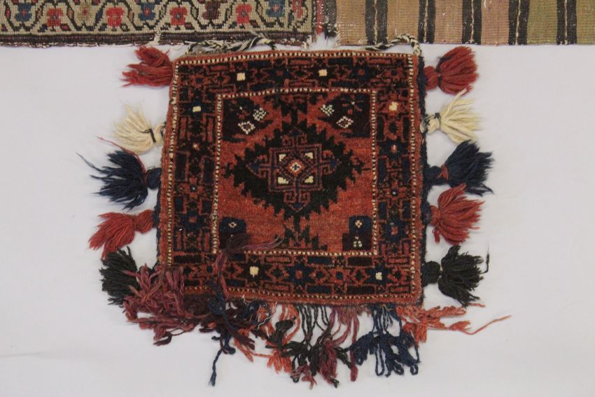 THREE PERSIAN SADDLE BAGS AND RUGS.