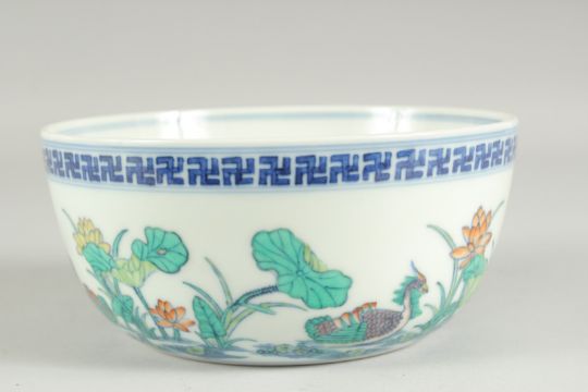 A CHINESE DOUCAI PORCELAIN BOWL, painted with birds and aquatic flora, the base with six-character mark, 16cm diameter.