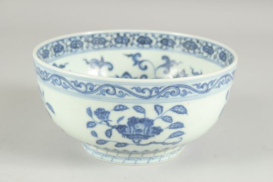 A CHINESE BLUE AND WHITE PORCELAIN BOWL, painted with various fruits and floral motifs, the base with six-character mark, 18cm diameter.