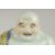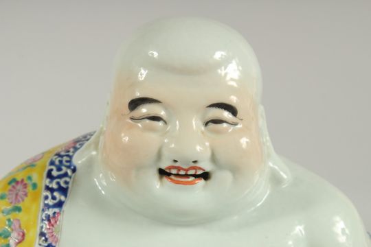 A LARGE CHINESE FAMILLE JAUNE PORCELAIN LAUGHING BUDDHA, the deity modelled in the seated position holding rosary beads, wearing a loose robe with floral pattern, the base with impressed seal mark, 27.5cm.