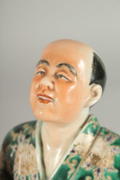 A JAPANESE KUTANI PORCELAIN FIGURE, of a seated man with a cat at his side, 18cm high.