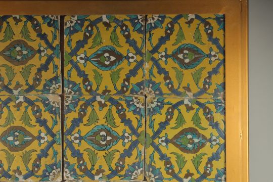 A SET OF SIXTEEN 19TH CENTURY SAFAVID STYLE IRANIAN QAJAR GLAZED POTTERY TILES, decorated with polychrome flower rinceau within black linework, the first on a yellow background, scrolls of fingered palms flowered with rosettes and lotus buds, the other on blue ground with floral garland, the tiles mounted and glazed within a single large frame, each tile approx. 22cm square, frame 103cm square. Two tiles of the same design appeared in Tajan auction, Paris, 13.11.2019.