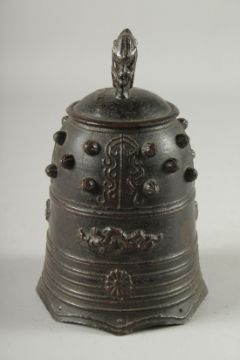 A CHINESE BRONZE PRAYER BELL, 19cm high.