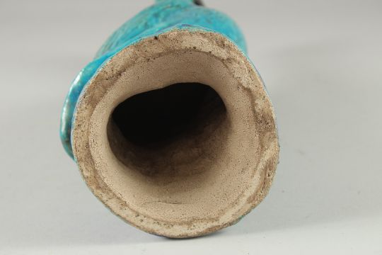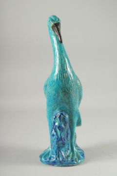 A 19TH CENTURY CHINESE TURQUOISE GLAZED POTTERY STORK, 40cm high.