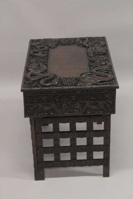 AN EARLY 20TH CENTURY CHINESE HARDWOOD FOLDING DESK / TABLE, with two small drawers and folding leg supports to each end, the whole profusely carved with dragons and Chinese devices, 74cm long, 48cm wide, 60cm high.