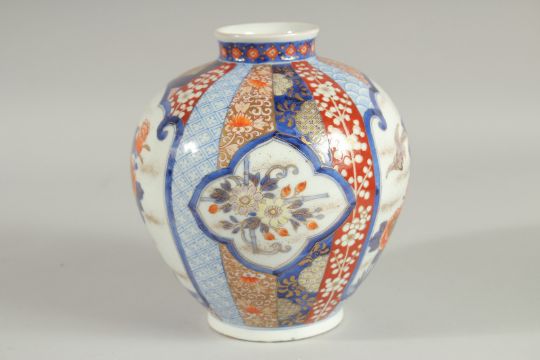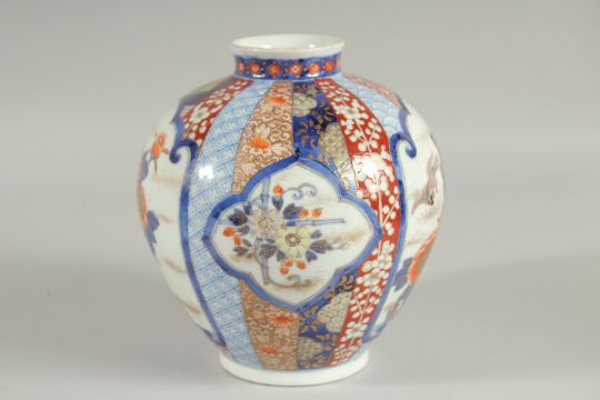 FINE JAPANESE IMARI PORCELAIN BULBOUS VASE, beautifully painted with panels of birds and native flora, further decorated with various stylised motifs and heightened with gilt highlights, the base with character mark, 18cm high.