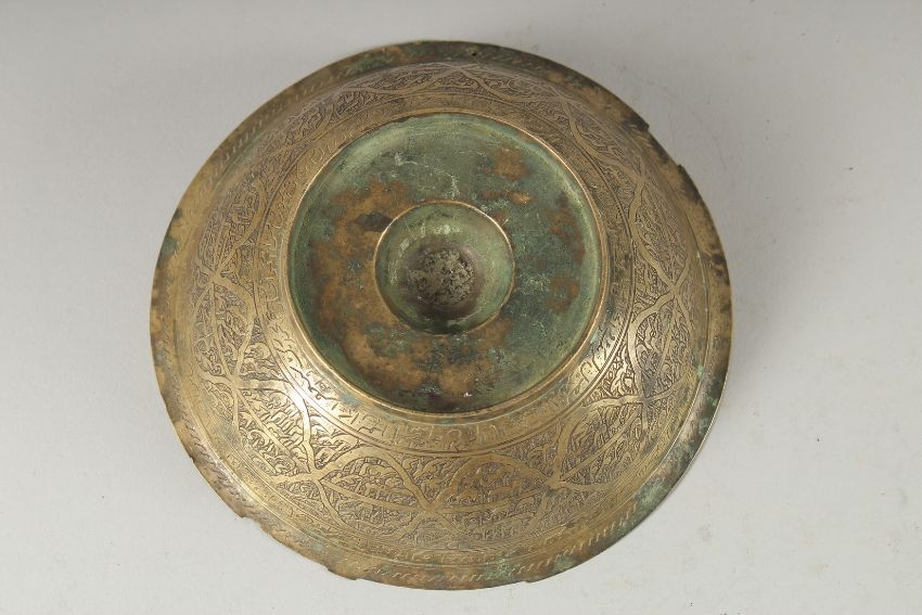 A 19TH-20TH CENTURY PERSIAN QAJAR ENGRAVED BRASS MAGIC BOWL, with panels of calligraphy, 16cm diameter.