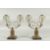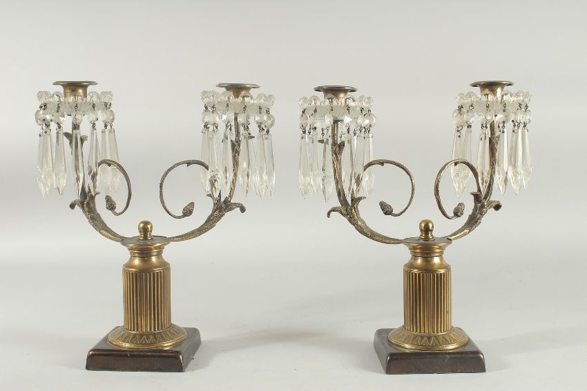 A PAIR OF 19TH CENTURY BRONZE AND CRYSTAL TWO LIGHT CANDELABRA with a pair of scrolling arms and prism drops on square bases.
