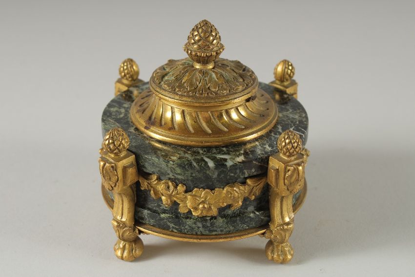 A GOOD 19TH CENTURY FRENCH CIRCULAR MARBLE AND ORMOLU INKWELL with pineapple finial, on claw feet.