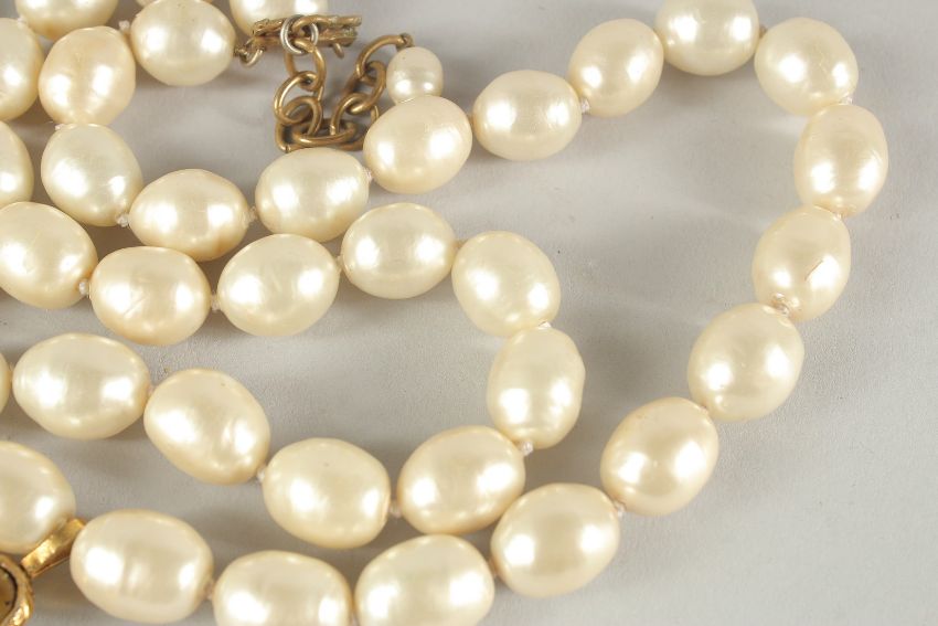 A GOOD LONG CHANEL PEARL NECKLACE, 42ins long with large pearl and enamel drop, in a box.
