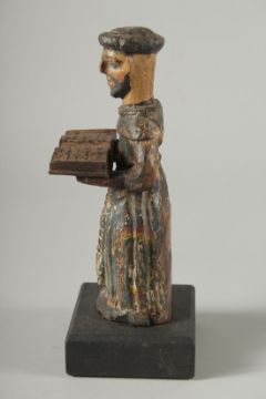 AN EARLY SPANISH CARVED WOOD MONK on a square base.