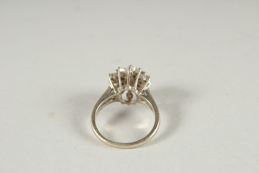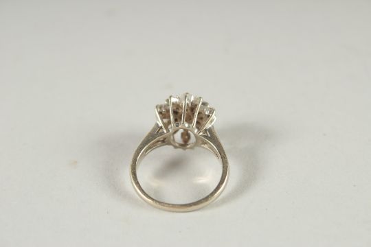 A 14CT WHITE GOLD DIAMOND CLUSTER RING.
