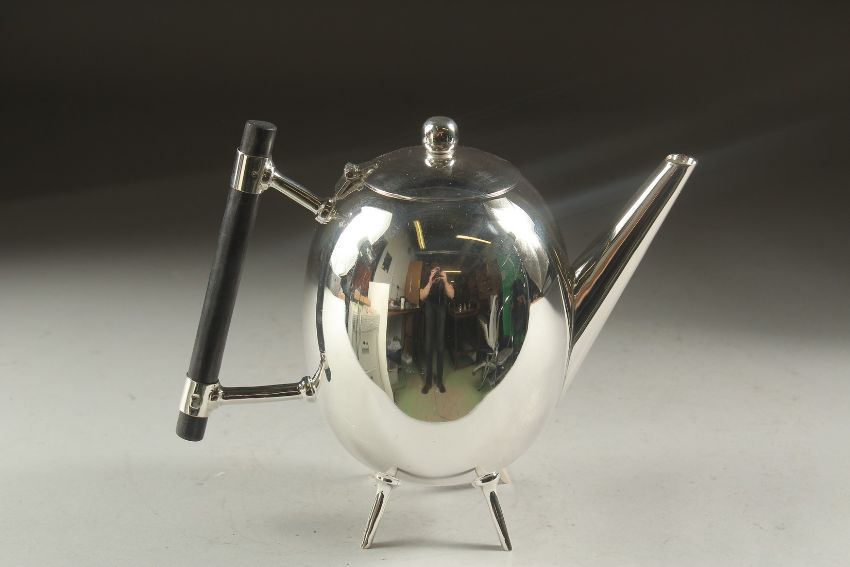 A CHRISTOPHER DRESSER STYLE OVAL SHAPED SILVER PLATED TEA POT..