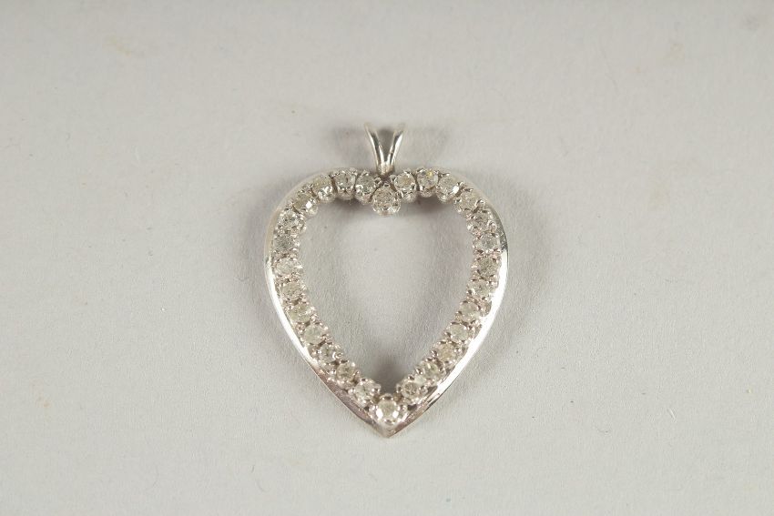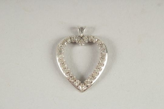A 14CT WHITE GOLD AND DIAMOND HEART SHAPED PENDANT.