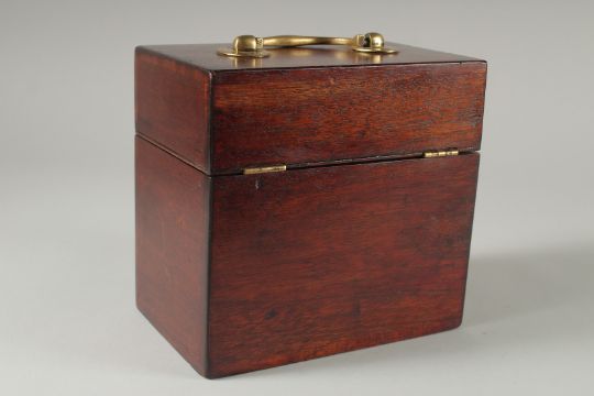A GOOD MAHOGANY APOTHECARY BOX with nine glass bottles, label inside, with brass carrying handles.