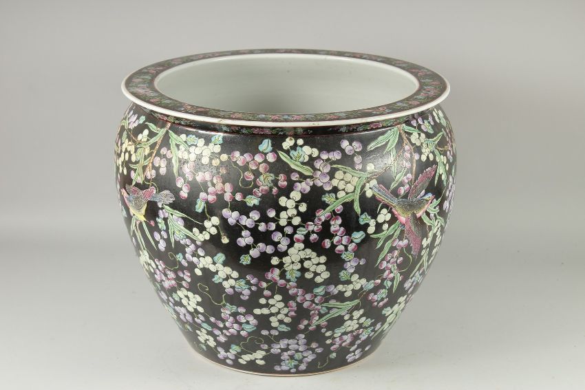 A LARGE FAMILLE NOIRE PORCELAIN FISH TANK decorated with birds, flowers and fish.