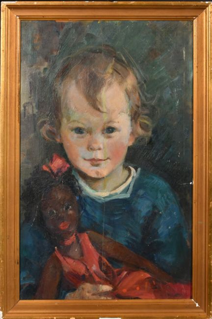 Early 20th Century French School, a young child holding a doll, oil on panel, 18" x 11" (46 x 28cm), a/f.