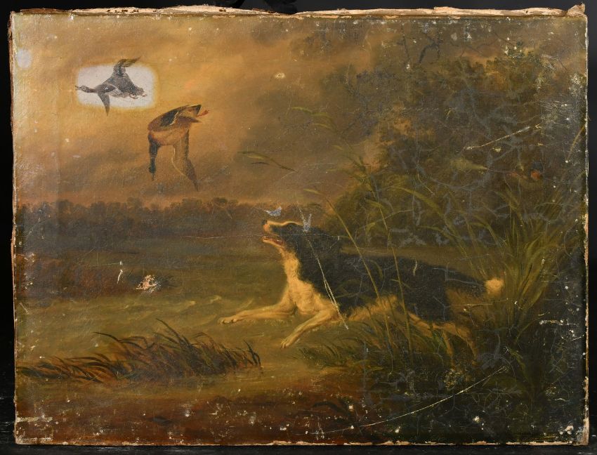 English School, Circa 1879, a huntsman and his Spaniel hunting ducks, oil on canvas, indistinctly inscribed and dated verso, 13" x 17" (33 x 43cm), unframed.