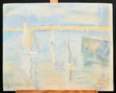 Terrick John Williams (1860-1936) British, a scene of boats entering a harbour, pastel, signed, 9" x 12" (23 x 30cm), (unframed).