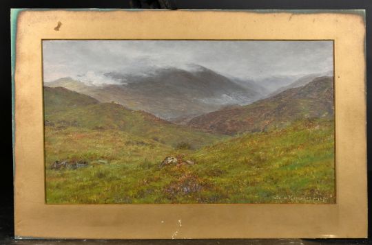 Late 19th Century School, a mountain scene with mist and cattle grazing, oil on card, indistinctly signed and dated 1888, 10" x 17" (25 x 43cm), unframed.