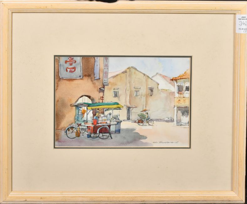 Mg Tun Hla, fishing boat on a Burmese River, watercolour, signed, 4" x 5" (10 x 12.5cm), along with a watercolour of street vendors by Ngo Teong Beng, 6" x 9" (15 x 23cm), (2).