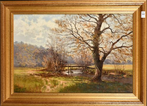 Arthur Bevan Collier (1832-1908) British, A wooden bridge over a stream with trees either side running through a field, oil on canvas, 16" x 24", (40.5x61cm).