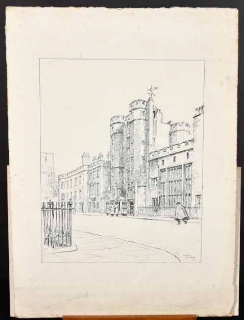 Hubert Williams, London views, Hampton Court, St. James's Palace, Strand Lane and Spitalfields Church, ink drawings, all signed, inscribed in pencil, two on board, one laid down, the other on paper, largest drawing size 17.5" x 12.25", (44.5x31cm) (unframed) (4).