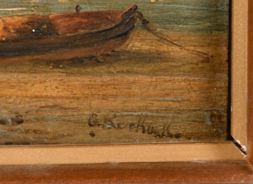Gerard Johannes Koekkoek (1871-1956), a leeboard barge off a quay at dusk, oil on panel, signed, 6" x 8" (15 x 20cm).