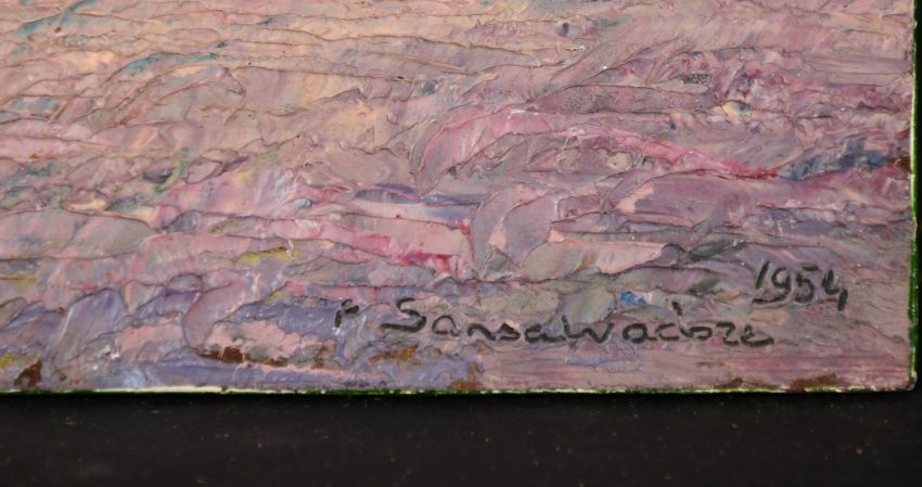 Pietro Sansalvadore (1892-1955), 'Twilight on London Bridge', oil on panel, signed and dated 1954, 8.5" x 11.25" (22 x 18.5cm), unframed.