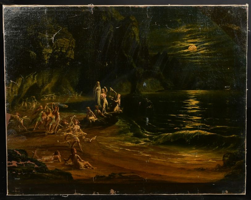 19th Century English School, female figures serenading in a moonlit cove, oil on canvas, 18" x 22" (46 x 56cm), unframed.