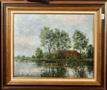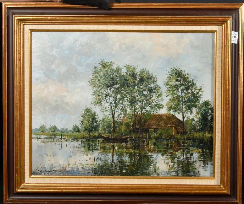 A. Van Noort, a boat amongst reeds with a riverside cottage beyond, oil on canvas, signed, 16" x 20" (40 x 50cm).