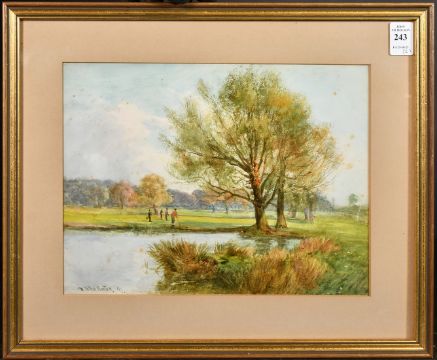 William Tatton Winter (1855-1928), a quartet of golfers about to play towards a green, watercolour, signed and dated 97, 8.5" x 11.5" (21.5 x 29cm), along with another smaller of a pond with reeds by the same hand, (2).