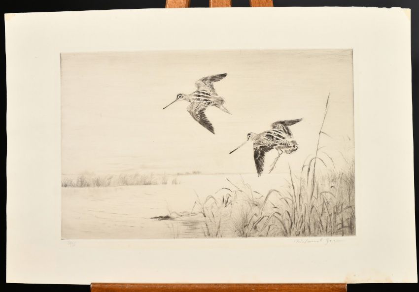 Roland Green (1890-1972), Snipe coming into land on a waterway, signed in pencil and numbered 31/75, plate size 7" x 10.75" (18 x 27cm), unframed.