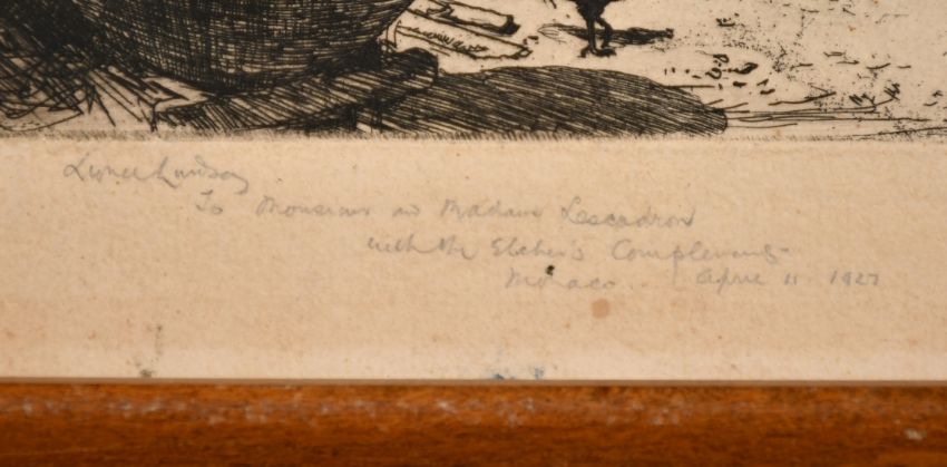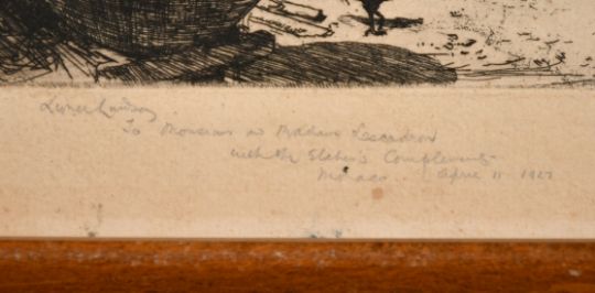 Lionel Arthur Lindsay (1874-1961), A Castilian Courtyard', etching, signed and dedicated in pencil, plate size 5.5" x 7" (14 x 18cm), along with William Palmer Robins (1882-1959), a figure in a windswept landscape, etching, signed, plate size 6" x 8" (15 x 20cm), unframed, (2).