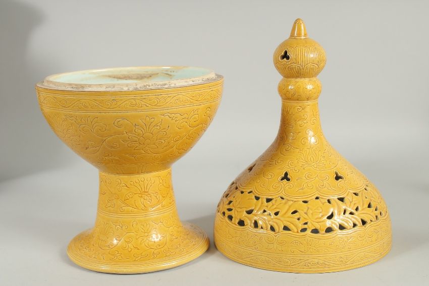 A CHINESE MING STYLE YELLOW GLAZE PORCELAIN INCENSE BURNER, with incised foliate decoration, the cover with a band of carved and pierced flora, 43cm high.
