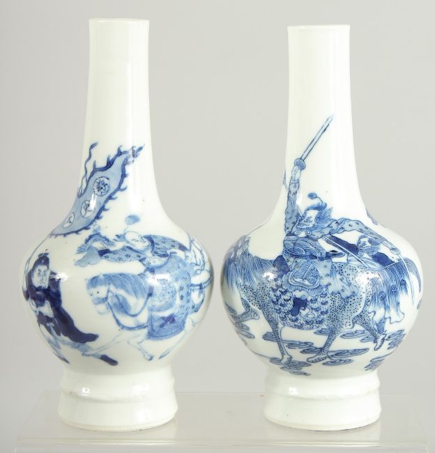 A FINE PAIR OF CHINESE BLUE AND WHITE PORCELAIN BOTTLE VASES, one painted with a warrior riding a beast, the other with a figure on horseback, each with six-character mark to base, 20cm high.