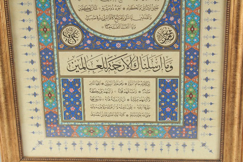 A LARGE ISLAMIC HILYA PANEL PRINT, with gilded highlights and decorative floral borders, bearing the name Abbas Al Baghdadi, framed and glazed, panel 66.5cm x 43cm.