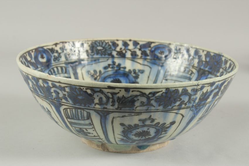 A 17TH-18TH CENTURY PERSIAN SAFAVID GLAZED POTTERY BLUE AND WHITE BOWL, with signature at the base, 28cm diameter.