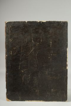 A QAJAR LACQUERED AND PAINTED BOOK COVER, decorated with a falconer on horseback with attendant, with floral pattern border and heightened with gilt highlights, 42cm x 32cm.