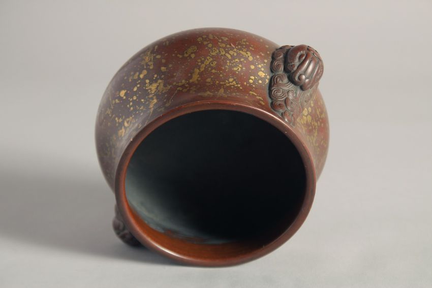 A CHINESE GOLD SPLASH BRONZE BOMBE CENSER, weighing 1.62Kg, the sides cast with double lion-head handles, the base cast with a seal mark, 6.3in wide including handles & 4.2in diameter at rim & 3.4in high to rim.