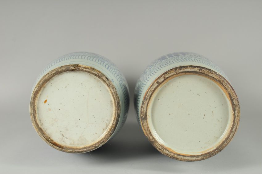 A PAIR OF 19TH CENTURY CHINESE BLUE AND WHITE PORCELAIN VASES, with moulded twin handles in the form of foo dogs and painted with foliate motifs, 43cm high.