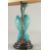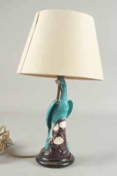 A CHINESE TURQUOISE GLAZE PORCELAIN PEACOCK PHOENIX, converted to a lamp base and mounted to a circular wooden stand, figure 23.5cm high.
