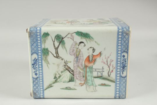A CHINESE FAMILLE ROSE PORCELAIN PILLOW, and later wooden stand, painted with scenes of female figures, pillow 22cm wide.