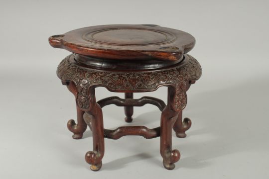 A LARGE CHINESE CARVED HARDWOOD STAND, with circular top, the skirt carved with bat motifs, elevated on five curving legs united by a circular stretcher, 21.5cm high, carved to fit a vase with a base of 13.5cm diameter.