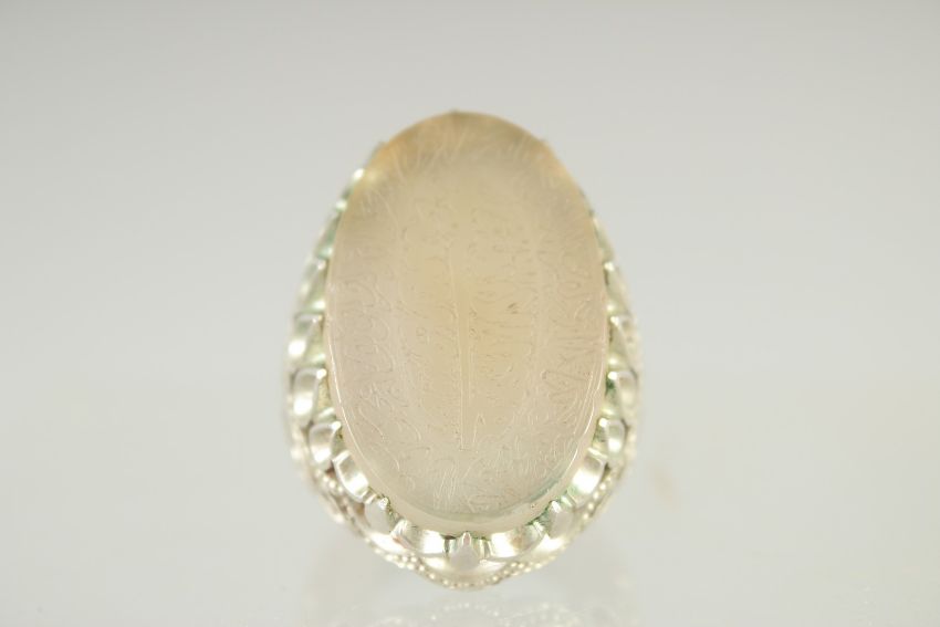A VERY FINE ISLAMIC AGATE CALLIGRAPHIC SEAL RING.