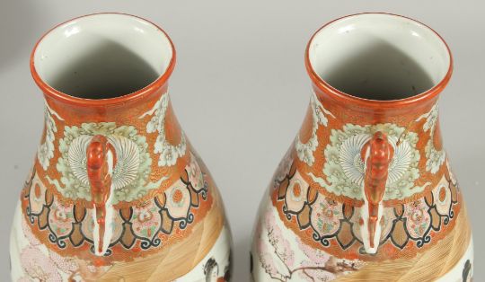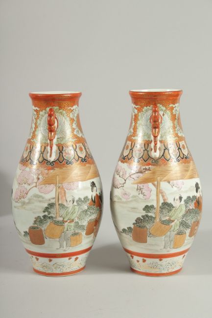A FINE PAIR OF JAPANESE KUTANI PORCELAIN TWIN HANDLE VASES, painted with a continuous scene depicting foraging figures and a female with children with buildings and mountains beyond, the vases heightened with fine gilt highlights, each with character mark to base, 31cm high.