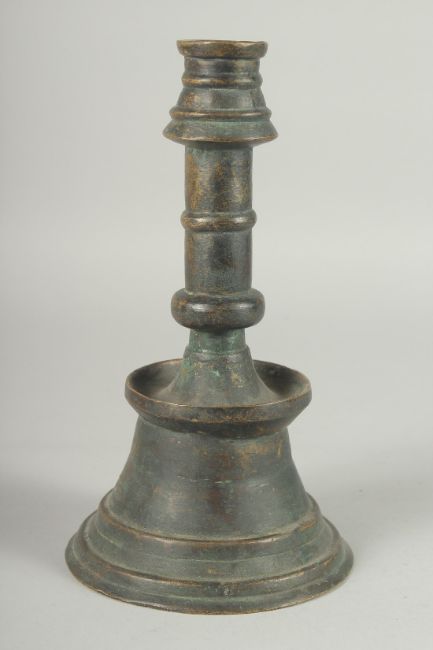 A 19TH CENTURY OTTOMAN BRASS CANDLESTICK, 28cm high.